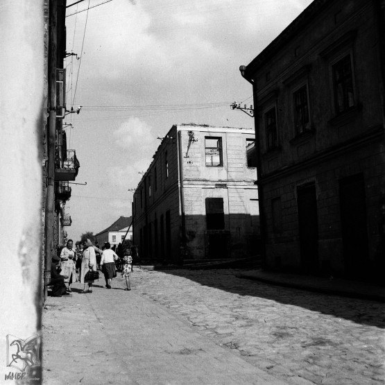 A view from Matejki Street towards Rynek. The balconies on the left belonged to the tenement house where Wiktoria and Michał Stasiuk lived. Their son Marian Stasiuk lived with his family in the opposite tenement house. A fragment of the Rynek 15 tenement house, under which the main part of the Jewish hideout was located, can be seen in the background.