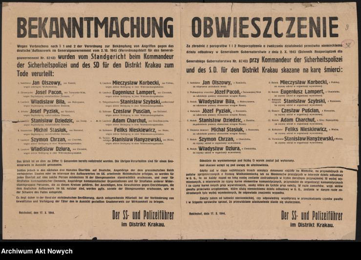A German poster from March 1944 with information about the people who were given death sentence, including Michał Stasiuk punished for helping Jews described as “elements hostile to the Reich”.