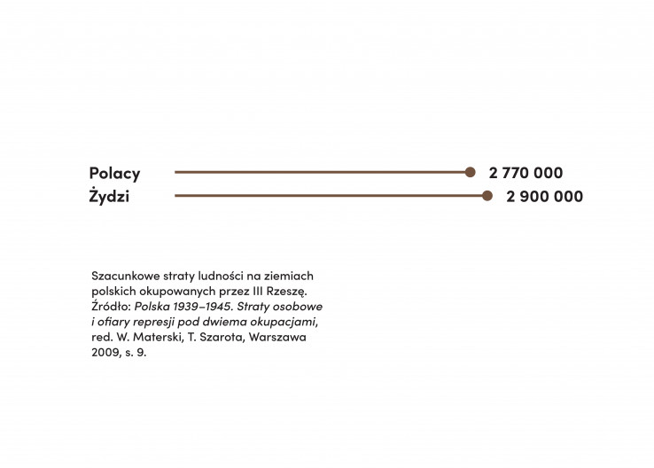 More than 5.5 million citizens of the Second Polish Republic were killed during the German occupation. Nearly 3 million of 3.5 million Jews lost their lives in the Holocaust. Poles were also treated as “sub-humans”; the German terror affected almost every Polish family.