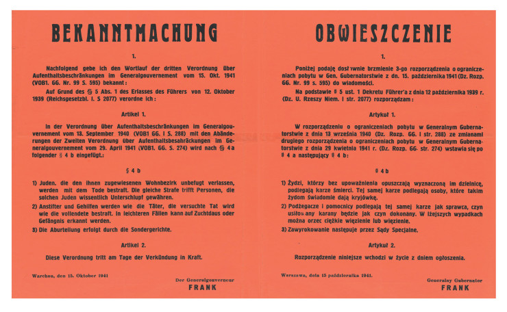 Jews who leave their designated district without permission shall be put to death. This punishment shall also apply to those people who willingly shelter those Jews.
