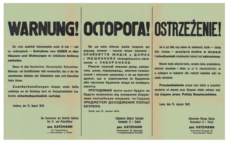 Germany’s occupational policies destroyed the solidarity which connected Poles and Jews. Special legislation introduced the death penalty for any Pole who aided the persecuted Jewish community. The Germans executed not only those individuals who sheltered Jews or gave tchem long-term help, but also those who showed simple gestures of humanity.