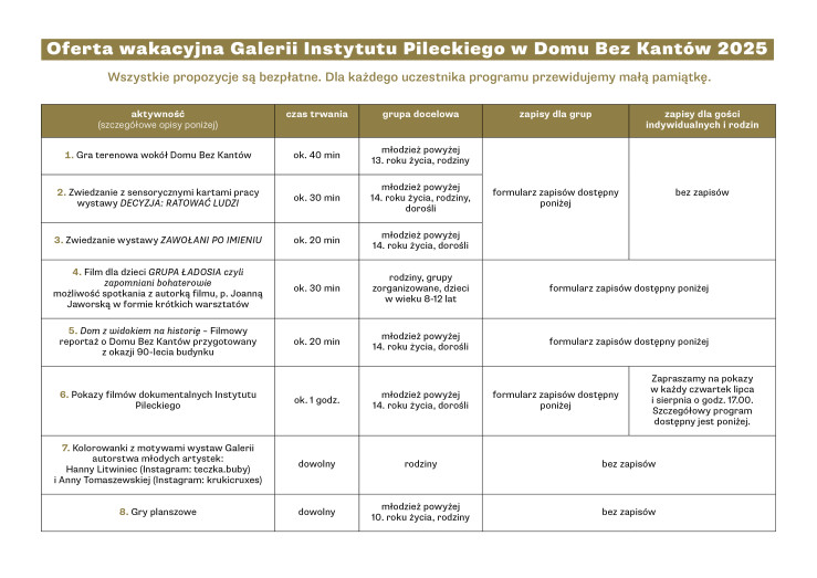 W te wakacje serdecznie zapraszamy do Galerii Instytutu Pileckiego, mieszczącej się w zabytkowym Domu Bez Kantów przy Krakowskim Przedmieściu 11. Przygotowaliśmy dla Państwa wyjątkowy program pełen wydarzeń edukacyjno-kulturalnych dla każdego!