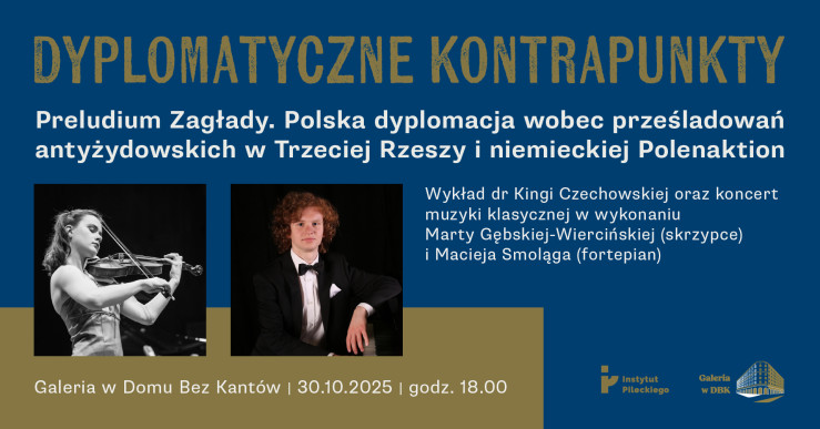 „Dyplomatyczne kontrapunkty” to seria spotkań w Galerii w Domu Bez Kantów poświęcona tym, którzy walczyli nie na frontach, lecz przy biurkach – posługując się jako orężem swoim podpisem i pieczęcią. To opowieść o polskich dyplomatach, którzy uratowali tysiące istnień ludzkich przed Zagładą.