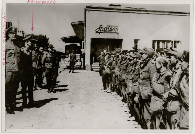 i Heinz Reinefarth (pierwszy i drugi z lewej) przemawiają do kompanii karnej,