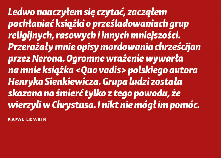 Od najmłodszych lat porusza Lemkina los ludzi prześladowanych ze względu na przynależność narodową i religijną. Jako dziecko czyta „Quo Vadis” Henryka Sienkiewicza – wielką powieść polskiej literatury – i dowiaduje się o cierpieniach chrześcijan w starożytnym Rzymie pod rządami Nerona.