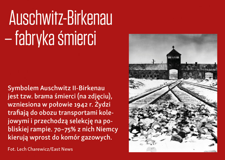 Niemiecki nazistowski obóz koncentracyjny i zagłady Auschwitz-Birkenau jest od 1942 r. jednym z głównych ośrodków Holokaustu. W ciągu trzech lat Niemcy mordują tu ok. 1 mln Żydów. Na stacji kolejowej ofiary przechodzą selekcję. Niezdolnych do pracy SS-mani kierują do „łaźni”, która jest w rzeczywistości komorą gazową. Trujący gaz w kilka chwil odbiera im życie. Ciała palone są w krematoriach. Odnajdowanych po latach przedmiotów osobistych ofiar nie da się najczęściej przypisać konkretnym osobom.