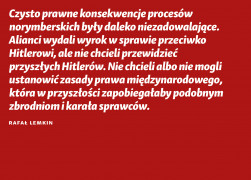 Zwycięstwo koalicji antyhitlerowskiej otwiera drogę do rozliczenia niemieckich zbrodni. W latach 1945-1946 przed Międzynarodowym Trybunałem Wojskowym w Norymberdze stają m.in.: Hermann Göring, Alfred Rosenberg i Martin Bormann. Zapada dziewiętnaście wyroków skazujących, w tym dwanaście na karę śmierci. Kolejne procesy odbywają się w amerykańskiej strefie okupacyjnej i w Polsce, gdzie w 1947 r. sądzony jest Rudolf Höß – komendant obozu Auschwitz-Birkenau. Zarazem wielu zbrodniarzy niemieckich unika kary.