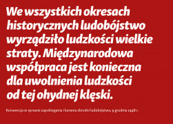 9 grudnia 1948 r. Narody Zjednoczone jednogłośnie przyjmują Konwencję w sprawie zapobiegania i karania zbrodni ludobójstwa. Czyny popełnione „w zamiarze zniszczenia w całości lub w części grup narodowych, etnicznych, rasowych lub religijnych” stają się zbrodnią w świetle prawa międzynarodowego. To oczywista konsekwencja tragicznego doświadczenia II wojny światowej. Konwencja ma służyć ukaraniu sprawców ludobójstwa i zapobiegać mu w przyszłości.