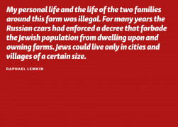He quickly realized that mass killings were not a thing of the past. In the years 1903-1906, an enormous wave of pogroms of Jews swept through Russia. As a matter of fact, the Tsarist police demanded bribes from Lemkin’s parents, because Jews were not allowed to live outside the Pale of Settlement.