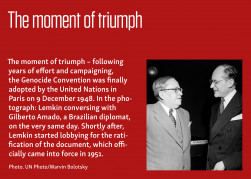 Those present in the conference hall at the Palais de Chaillot passed on their congratulations to Raphael Lemkin – after all, the newly adopted document was commonly referred to as “Lemkin’s convention”. A Polish lawyer of Jewish origin who had lost almost his entire family in the Holocaust, he was the originator of the term genocide, having defined this crime and documented it with examples. Lemkin also prepared the first draft of the Convention and spearheaded a campaign for its adoption. To this day, the document serves as the international community’s principal instrument protecting it from genocide – “the crime of crimes”.