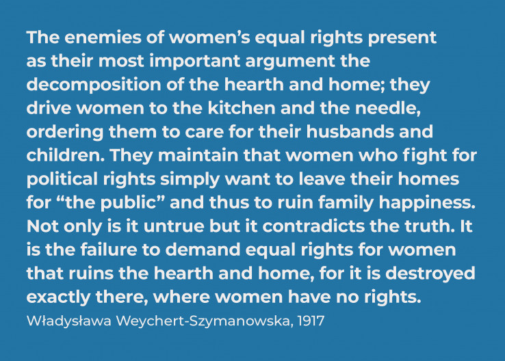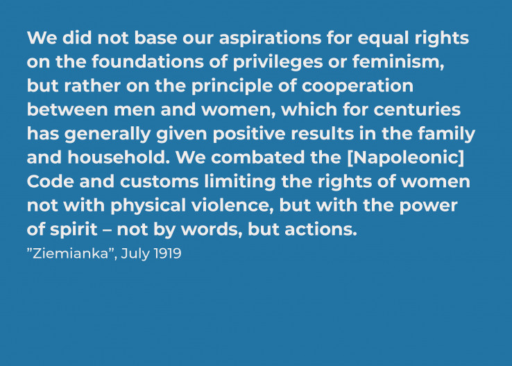Despite the difficulties posed by the partitions and the lack of self-determination, the course of the process of women’s emancipation in the Polish lands was in many ways the same as in other countries. Similar issues were explored: the division of the social roles of women and men, civilizational challenges, access to education, profitable employment, and electoral rights. And, similarly, active Polish women became members of feminist and Christian-Democratic groupings.