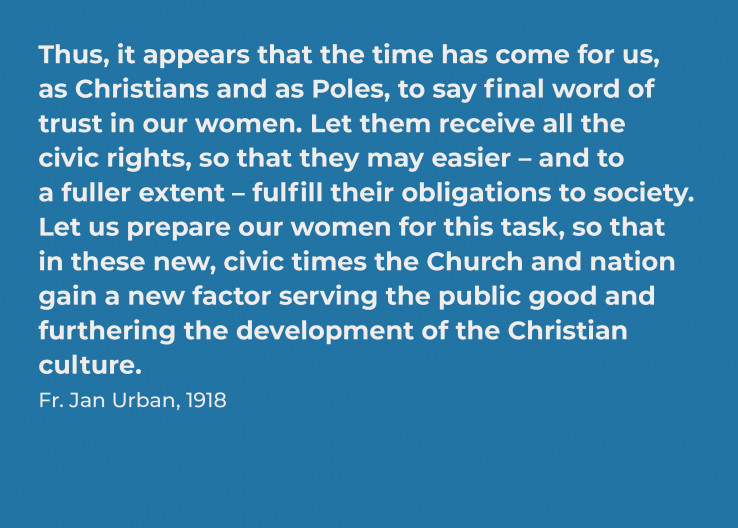 As opposed to developments in Western Europe, no Christian-Democrat party was established in the Polish lands. However, on the basis of social life there came into being a women’s association, the United Association of Landed Proprietresses (UALP), which based its program on the Catholic social teaching.