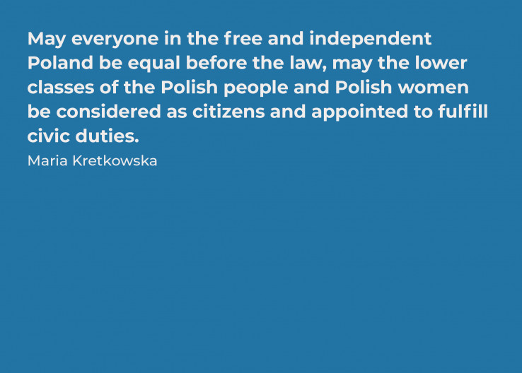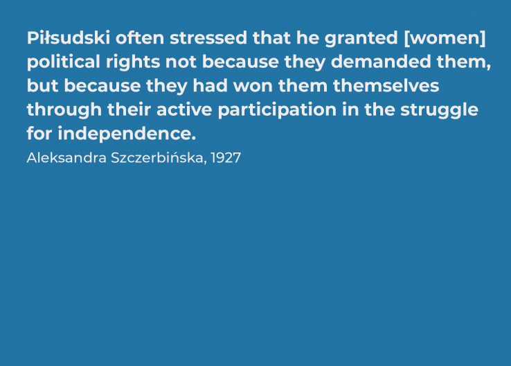 That women were granted political rights in 1918 was the result of a great many causes. During the partitions Polish women were the primary carriers of the nation’s cultural code, which was handed down to successive generations. Women from the youngest age group, who fought on the fronts of the First World War, strove to gain the position of a causative factor in history. The slogan of the “heroic act”, introduced by Maria Dąbrowska during the war, also helped overcome the stigma of the failure of the January Uprising, which their grandmothers had witnessed or in which they had actively participated. The 1918 Decree expressed Piłsudski’s acknowledgement of women’s contribution to culture and society, and of their patriotic dedication during the war time. Thus, Poland’s return to the map of Europe became conjoined with the emergence of Polish female citizens who were aware of their rights.