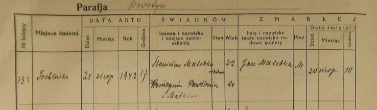 Dokumentem jednoznacznie potwierdzającym śmierć Jana Maletki – 20 sierpnia 1942 roku o godz. 10 w Treblince w wyniku „postrzału” – jest akt zgonu z księgi parafialnej z Prostyni. Jako świadkowie podpisani są tam Stanisław Maletka, brat zabitego, oraz Remigiusz Pawłowicz, autor relacji, na którą powoływał się w swojej książce Wacław Zajączkowski.