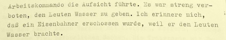 „Surowo zabronione było podawanie ludziom wody. Pamiętam, że zastrzelono kolejarza za to, iż przyniósł ludziom wodę” (Fragment zeznań Franciszka Ząbeckiego ze skanu dokumentu: Vernehmungsniederschriften aus der Hauptverhandlung (31.-40. Verhandlungstag, 22.12.1964–19.01.1965), zeszyt 3).