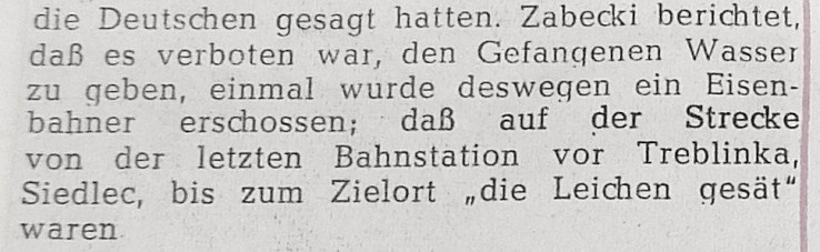 Ząbecki mówił, że zabronione było podawanie więźniom wody. Raz nawet zastrzelono z tego powodu jakiegoś kolejarza; mówił, że odcinek od ostatniej stacji przed Treblinką, Siedlec, aż do stacji docelowej «był usiany trupami».